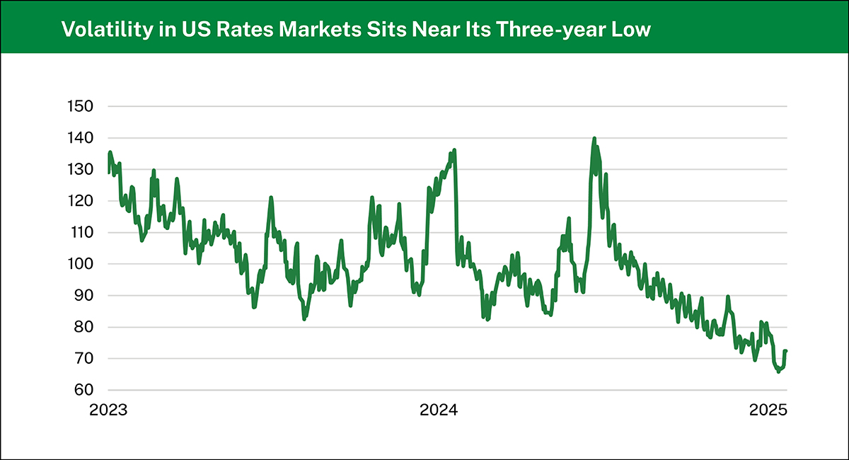 The MOVE Index, which tracks implied volatility in US rates markets, now sits near its three-year low. Investors should consider maintaining exposure to the tails of the distribution, as complacency may prove costly in a year shaped by policy uncertainty and shifting macro dynamics.